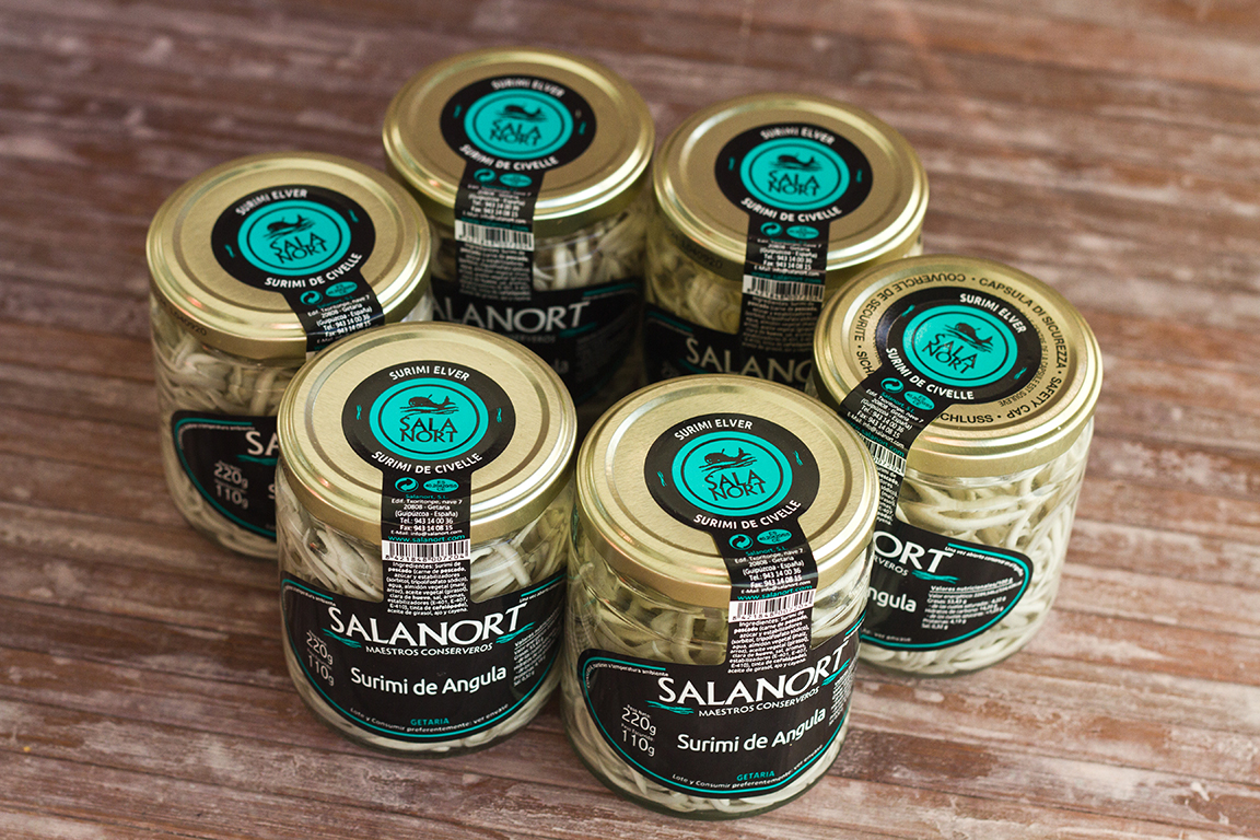 Surimi de pescado en forma de angula. Cocinado en aceite con ajo y cayena.