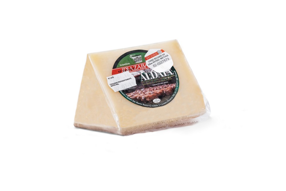 Cuña de queso de leche cruda de oveja Latxa. El queso Aldaia es queso de pastor 100%. Proviene de la quesería Navarra del mismo nombre que utiliza exclusivamente leche de sus propias ovejas.